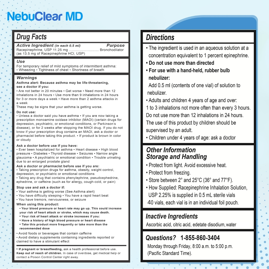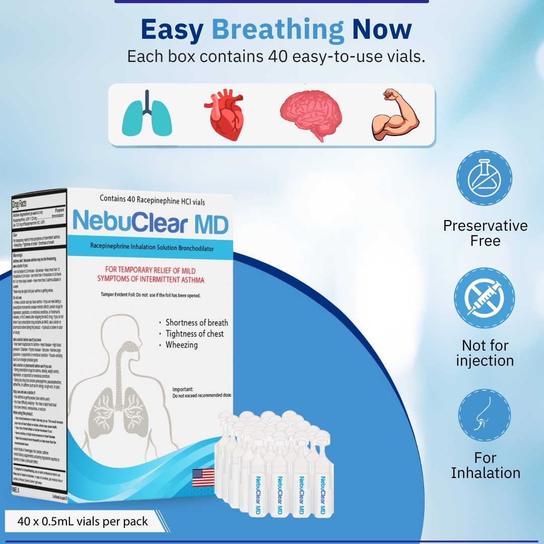NebuClear MD is a fast-acting, nebulizer-ready inhalation OTC drug specially formulated to support respiratory health in individuals with mild, intermittent asthma. Each unit-dose vial delivers consistent and effective relief by helping to thin mucus, open airways, and improve breathing comfort.